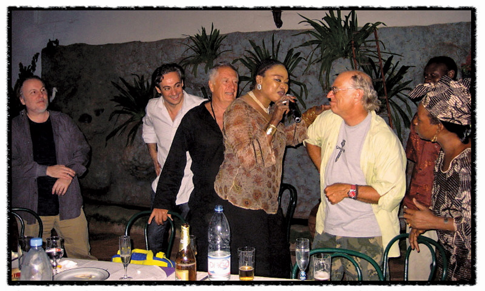 Let’s just say that Oumou Sangare stands out in a crowd. Though I had seen only CD-size photos of her, I immediately recognized the elegant woman seated at a long table behind the dance floor waving us over. Oumou greeted our gang of desert rats with hugs and kisses. No sooner had we taken our seats than buckets of champagne and hors d’oeuvres covered the table. The party was continuing. Talk about a multitasker: Oumou carried on conversations with us and other friends in English and French and at the same time chimed in with lyrics to the music coming from the bandstand as she posed for photos with passing fans. Somehow in the middle of all of her “plate spinning,” she found time to conspire with Syndou, and the next thing I saw was Syndou opening the guitar case and taking out my Little Martin. I was about to tell him to put it back when Oumou stood up and spoke into her wireless microphone and announced, in three languages, my impending debut performance at Wassulu Hôtel Résidence. When she was finished, she put her hand on my shoulder and whispered in my ear, in that laissez-faire style, “Jimmy, pas de problème. Il est quatre heures du matin” (No problem! It’s four in the morning).