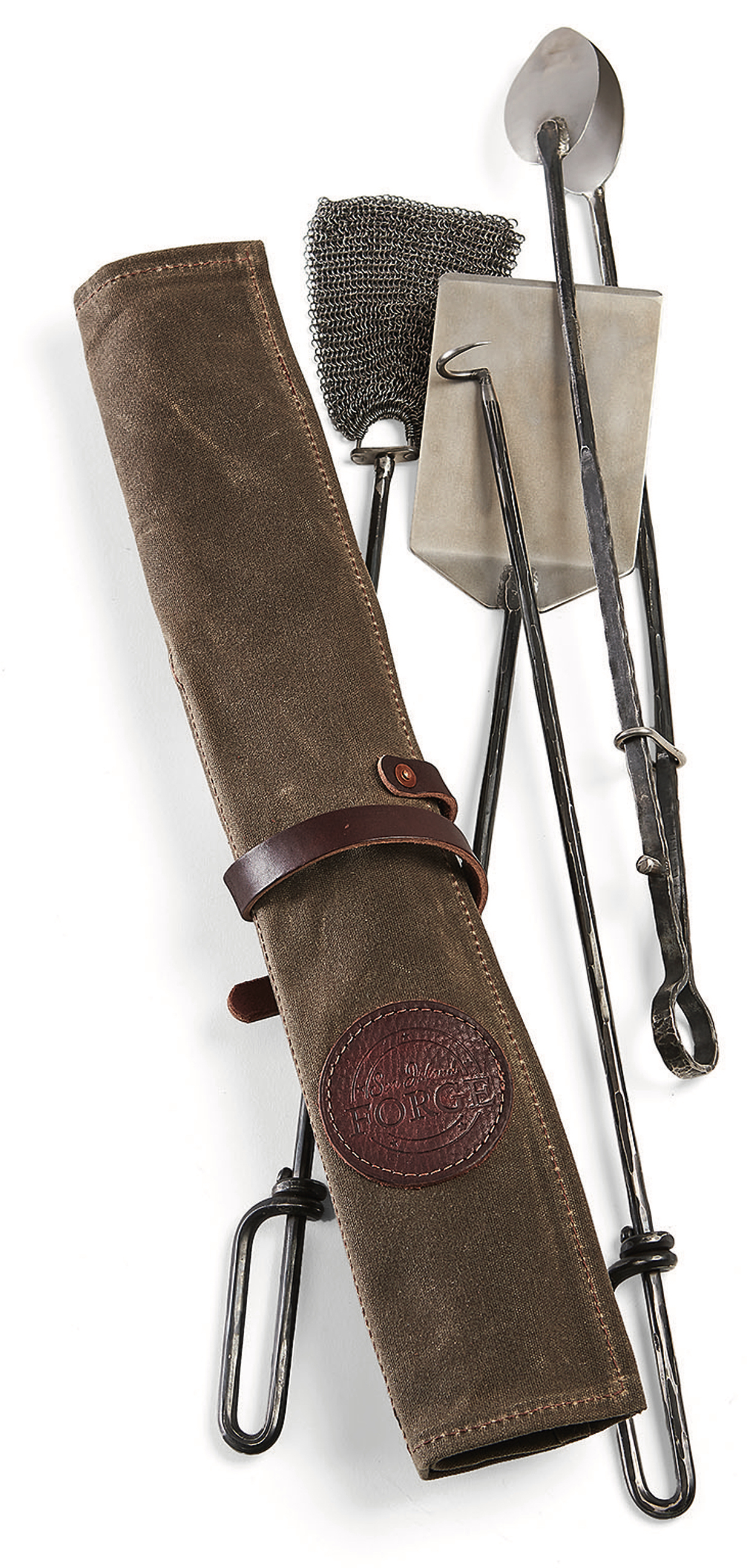 Steve and Sandy Schoettle always loved a night of lingering around an outdoor fire—so much so that they drew on their combined experience in construction, custom furniture, product design, and art to launch Sea Island Forge with a thirty-gallon firepit in 2014. “Spending even more time around the fire made me think, Wow, I’d love to throw a steak on there,” Steve says. A natural progression of offerings followed: a grill, a flat-iron griddle, skewers, and this set of artisan grill tools. Wrapped in a waxed canvas roll and sold as a set or individually, the spatula, sop mop for basting, tongs, and pigtail flipper are made of food-grade stainless steel that’s hammered, oxidized, and polished for an antique patina. Though each tool has thoughtful touches (the tongs are large enough to grip potatoes, the mop’s chain-mail head is a snap to clean, and the spatula has a thinned edge for easy sliding), Steve most often reaches for the pigtail flipper. “I flip everything with it,” he says. “Avocados, romaine, grilled garlic bread, you name it.”