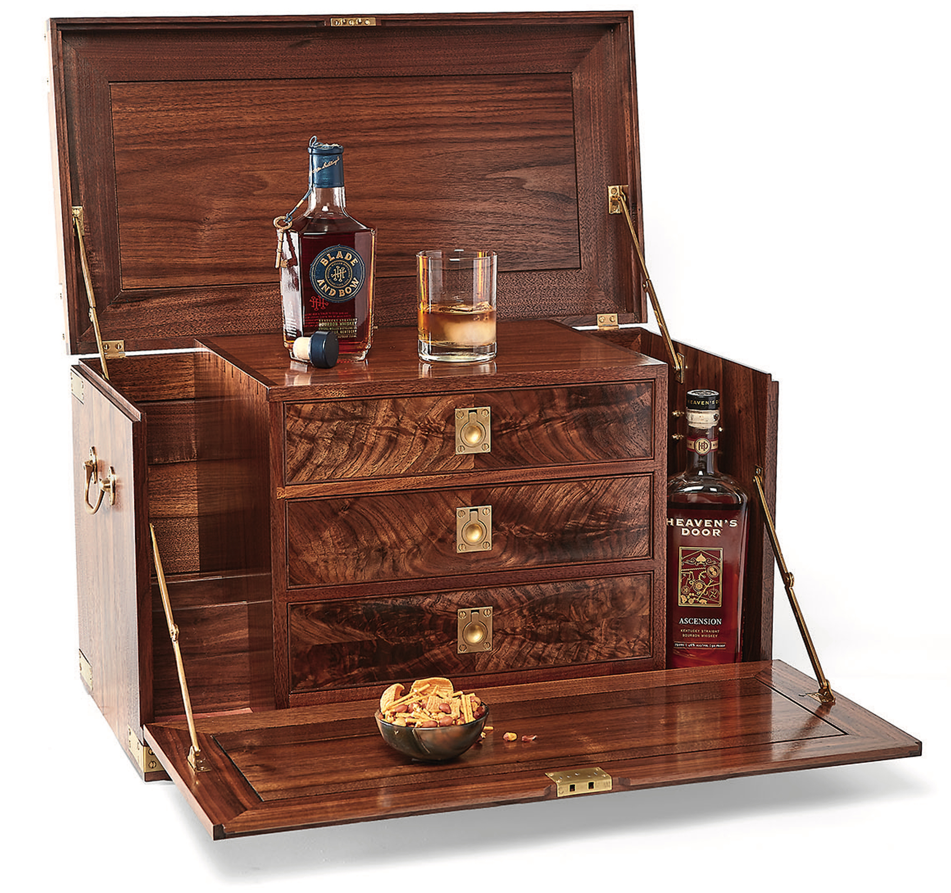 “I have a degree in physics, so I gravitate toward simpler geometric forms,” says Daniel Hartmann. But minimalist design doesn’t necessarily mean modern or contemporary, the woodworker says: “The Shakers have been doing simple and unadorned for hundreds of years.” For his handsome Lookout Mountain Field Bar, though, Hartmann looked to the mobile campaign-style furniture the British army created in the late eighteenth and nineteenth centuries. Traditionally, campaign furniture is made from a tropical wood, but Hartmann favors the homegrown beauty of American walnut found around his Tennessee studio. The resulting field bar, which can hold six bottles and eight glasses, plus tools and garnishes, takes about four weeks to complete due to the intricate nature of Hartmann’s work; there are at least a dozen brass inlaid fittings, each requiring around an hour to install. And he applies all eight coats of varnish by hand. Enjoy a stogie with your drink? Hartmann can craft a custom humidor to go with it.