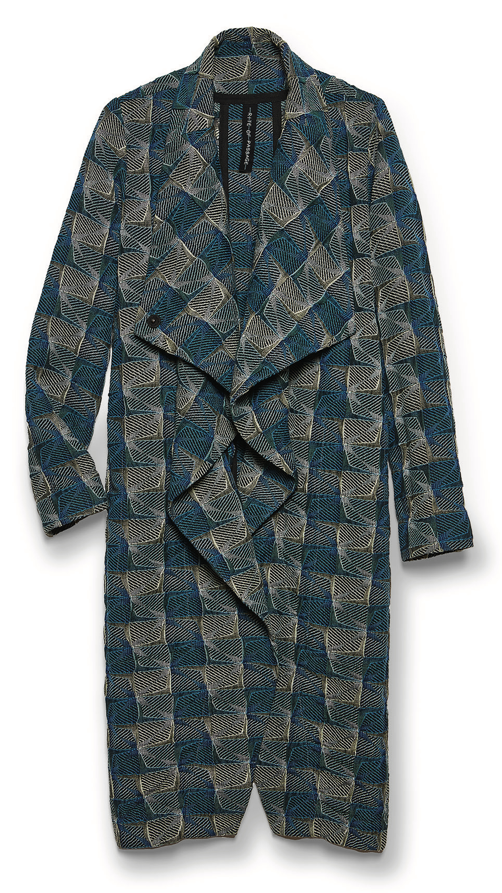 There was plenty about the American fashion industry that entrepreneur Libby O’Bryan and designer Giovanni Daina-Palermo didn’t like—notably, the loss of skilled labor to overseas jobs and a lack of sustainability. They founded Rite of Passage in 2018 to help right some of those wrongs. “We’re not interested in being a part of the problem, so we pay living wages and make high-quality garments that are going to last,” O’Bryan says of their signature pieces, including this unisex, all-season Envelop coat. They built the brand around O’Bryan’s existing partnership with the Oriole Mill in Hendersonville, North Carolina, which produced small-batch jacquards and other bespoke fabrics. When the pandemic shuttered the mill, the team relocated to Asheville’s River Arts District and began seeking out new sources for American-made fabric, which included salvaging the Envelop’s blue-tile jacquard from vintage, backstock Jhane Barnes bolts found at another closing North Carolina mill.
